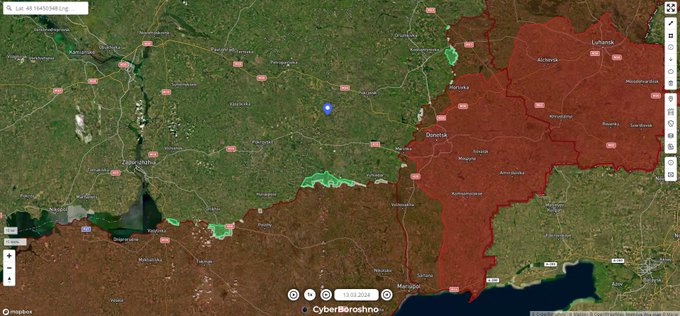 Begint Rusland na twee jaar dan eindelijk schimmen te tonen van de militaire capaciteiten die bij een vermeende supermacht horen? Bovenstaand is te zien hoe gisteren een drietal Mil Mi-8-helikopters (wiki) door clustermunitie geraakt worden, voordat twee geleide raketten twee van de drie heli's vernietigen. De middelste lijkt te ontkomen. Gisteren meldde Oekraïnes 12th Army Aviation Brigade - die beschikt over Mil Mi-8's - de dood van twee piloten en zeer waarschijnlijk heeft dat met het bovenstaande voorval te maken. Volgens de onderstaande GeoLocatie vond de aanval 45 kilometer achter Oekraïense linie plaats, en da's aardig wat.